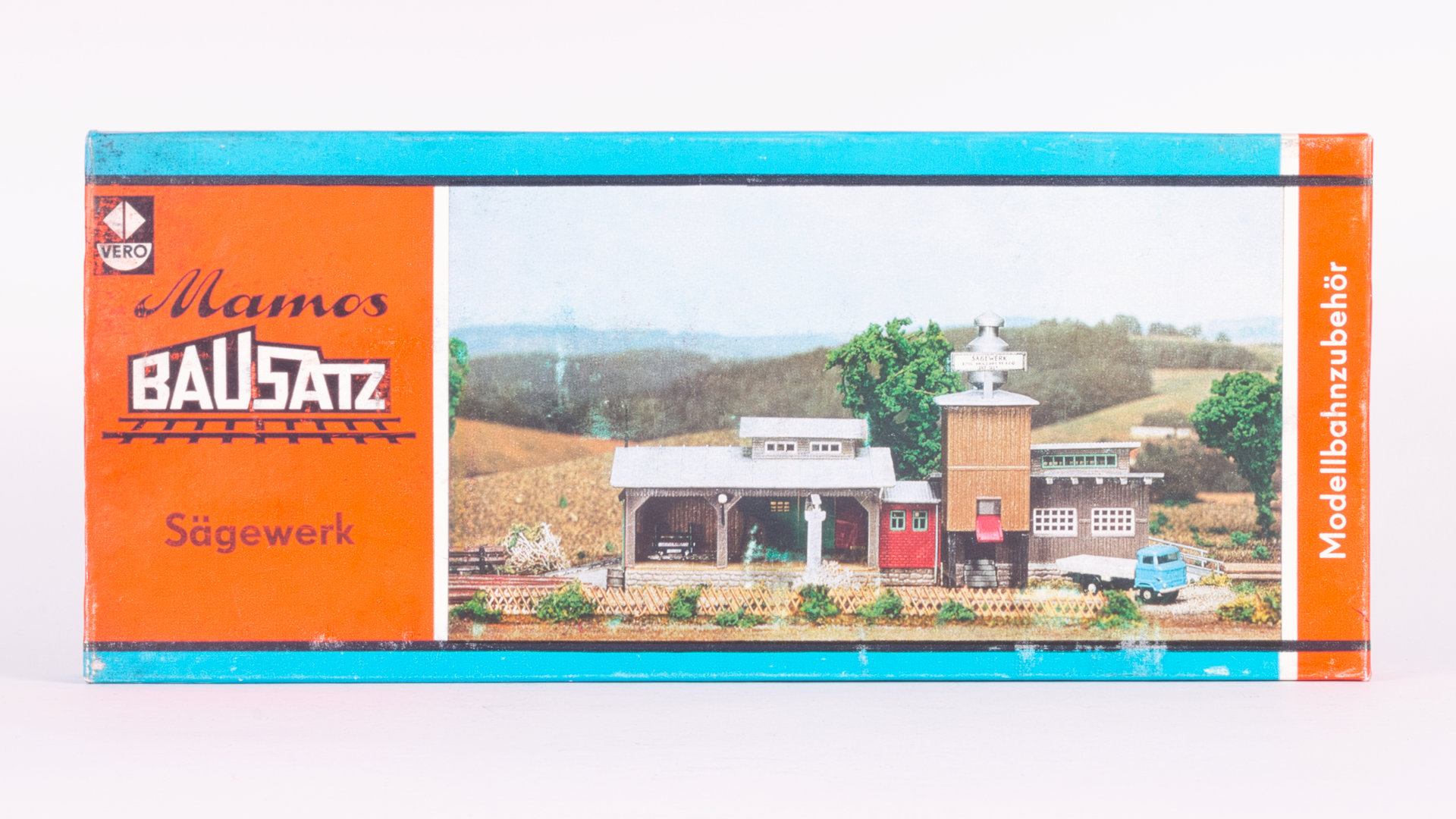 Das Sägewerk bedient mit der Nenngröße 1:100 einen Zwischenmaßstab und ist für H0 (1:87) und TT (1:120) gleichermaßen (un)geeignet. Der Bausatz stammt vermutich aus den 1980ern und ist bei Auhagen noch heute (2025) neu unter der Artikelnummer 12217 erhältlich.