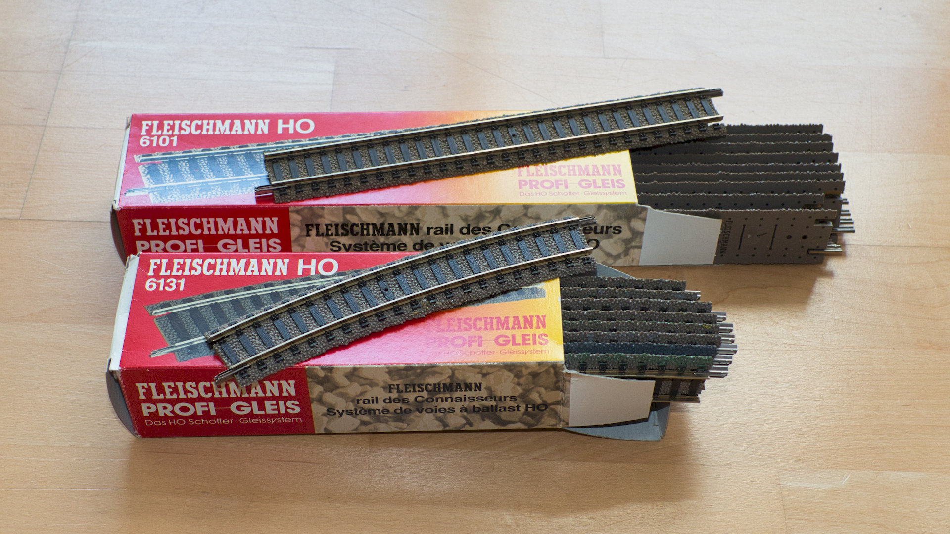 Auf unserer Modellbahn-Anlage sind ca. 50 m Fleischmann Profi-Gleis H0 mit Bettung verbaut. Nur wenige Meter davon haben wir neu gekauft. Die gebrauchten Gleise waren meist in gutem Zustand zu einem fairen Tarif zu haben. Ein Vorrat an oft verbauten Stücken macht jederzeit Erweiterungen und Reparaturen möglich. Das gilt leider nicht für den Bogen R3 18° r = 483,5 mm, Artikel 6131. Bestand: 0.