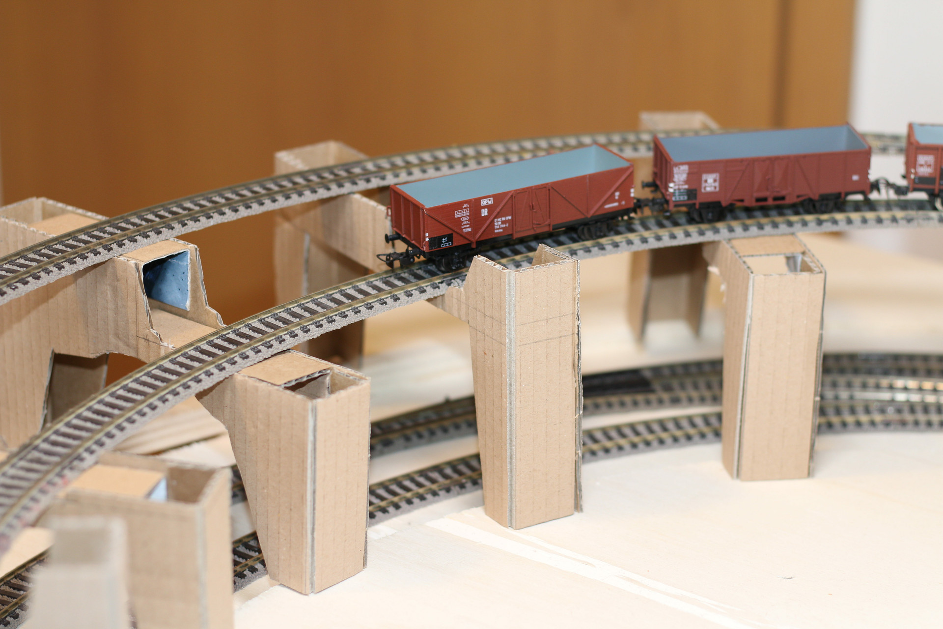 Mit leckeren Keksen von meiner Lieblings-Ehefrau und stimmungsvoller Weihnachtsmusik war der Bau der Papp-Stützen eine sehr entspannende, erholsame Angelegenheit, die den Alltag vergessen ließ. Tests mit verschiedenen Zügen, deren Lokomotiven nicht für eine hohe Zugkraft berühmt sind, verliefen erfolgreich. Die Steigungen sind problemlos zu bewältigen! Die Stabilität ist für unsere Zwecke vollkommen ausreichend. Mal sehen, wie lange dieses Provisorium bestehen bleibt ...