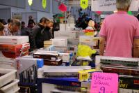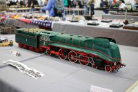 Hinter dem Haupteingang landeten wir in der Modelleisenbahn-Abteilung, in Halle 19. Grosse Modul-Anlagen in allen möglichen Formen, Spurweiten und Farben buhlten um die Gunst der Besucher. Neben Vereinen waren auch Händler mit neuer und gebrauchter Massenware, aber auch mit interessanten Produkten aus Kleinserien, Individual- und Hobby-Entwicklungen vertreten. Besonders faszinierend fand ich Lokomotiven und Waggons aus Karton, deren Bauweise auf den ersten (und für mich auch auf den zweiten) Blick nicht zu ersehen war. Draussen drehten zwei Echtdampf-Parkbahn-Lokomotiven ihre Runden und zogen kleine Ausstellungs-Besucher über ein Oval. Ich hatte selbstverständlich den Fotoapparat dabei und knipste fleissig um mich. Ein Händler wies mich barsch darauf hin, nicht im Internet erscheinen zu wollen. Ich respektiere seinen Wunsch. Alle anderen zeigten stolz ihre Produkte.