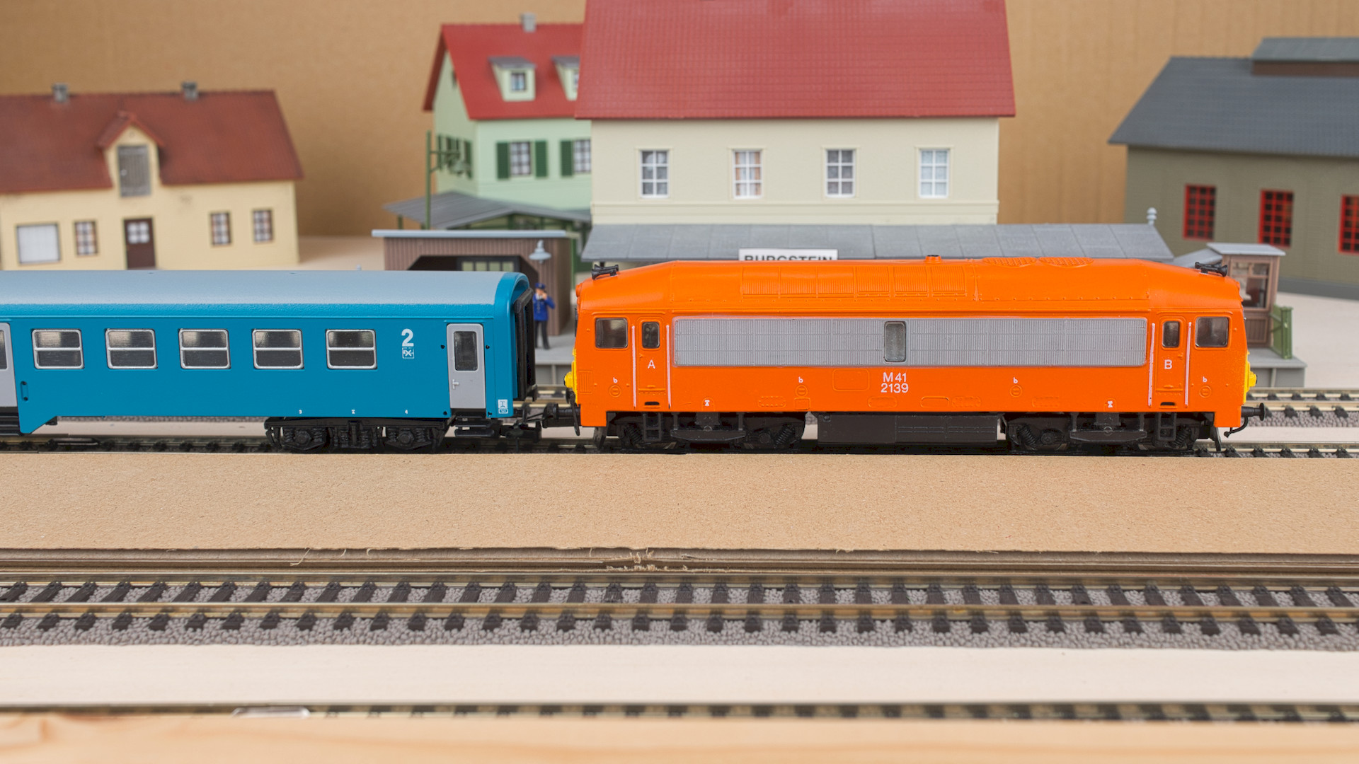 Unsere Modelleisenbahn ist von schönen Landschaften noch weit entfernt, aber das hält mich natürlich nicht davon ab, sie trotzdem zu fotografieren. Schließlich ist ein schöner Zug auch auf einer Sperrholzplatte ein schöner Zug!