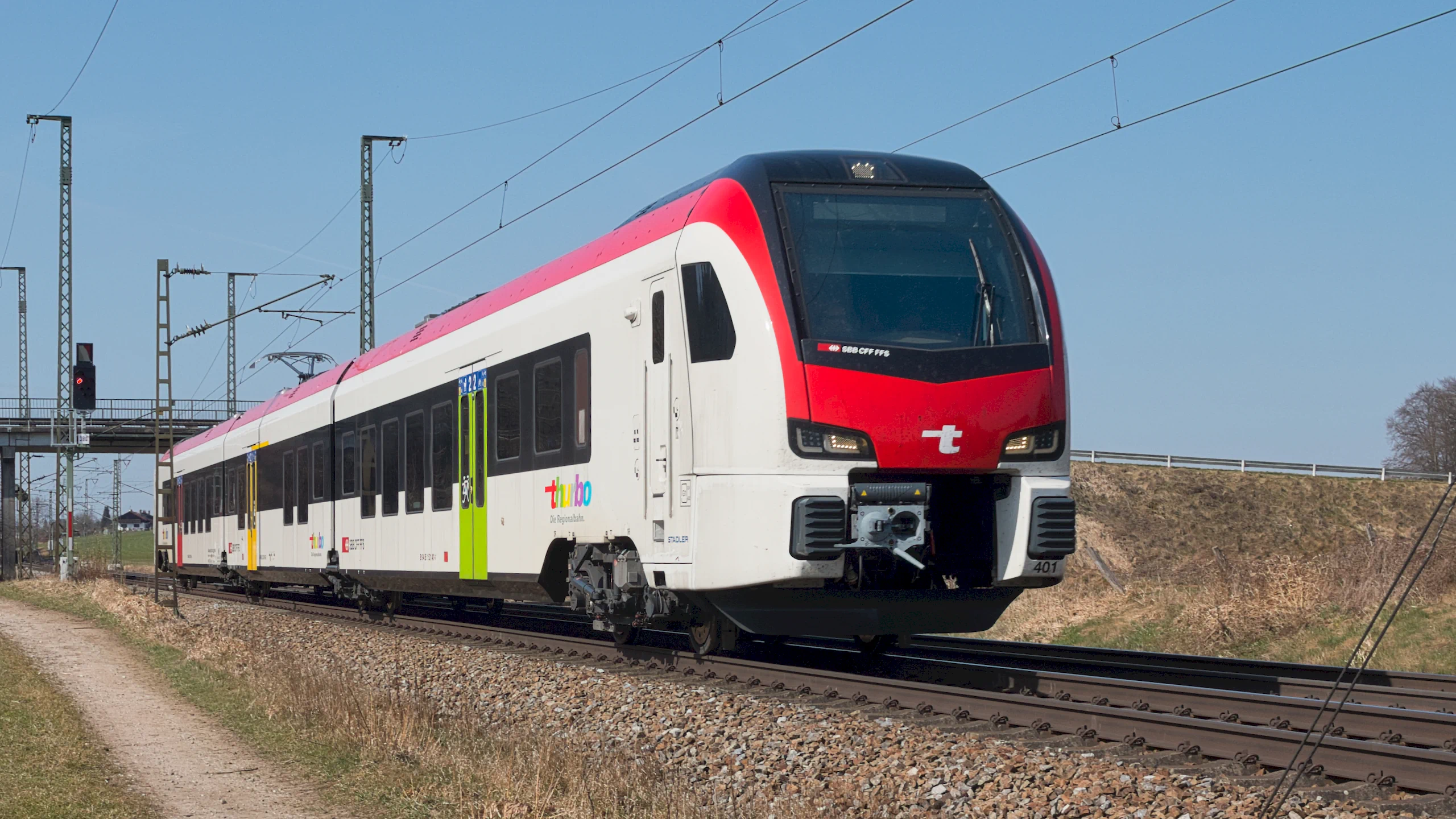 Stadler Flirt Evo thurbo auf Testfahrt bei Niederstraß, am 10. März 2026.